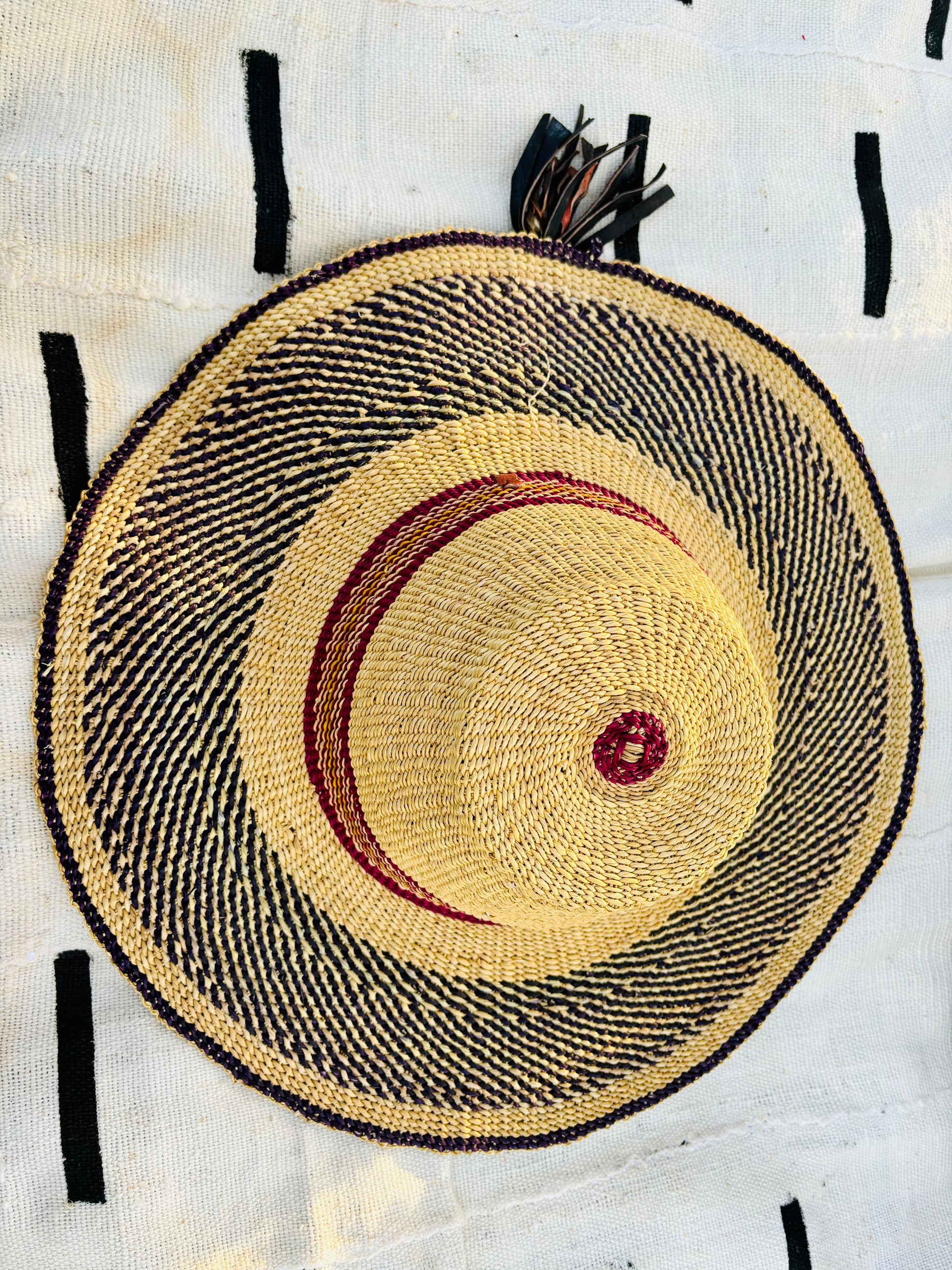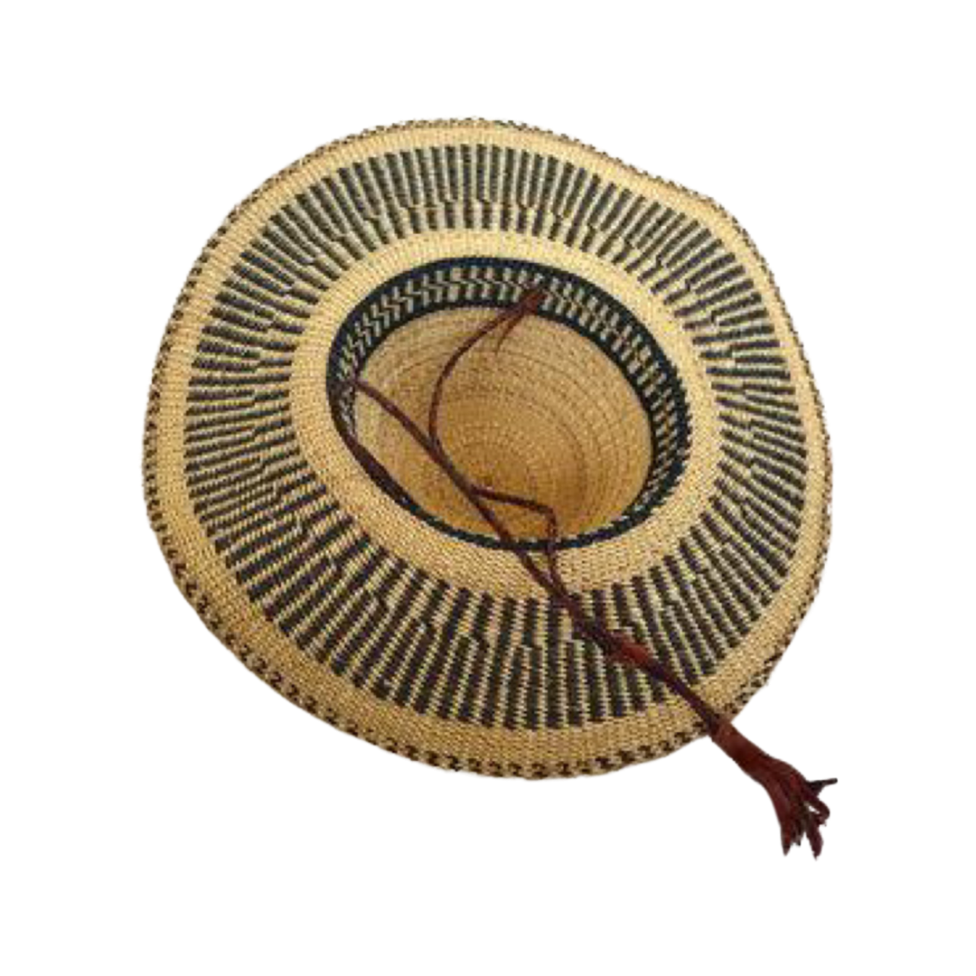 These straw hats are masterfully handwoven in Ghana by women artisans. They are sometimes called Bolga hats because they come from the Bolgatanga region of northern Ghana. They are woven from a wild savanna grass called kinkahe or elephant grass, and have a braided leather adjustable chin strap. Can be worn or hung up as wall art.