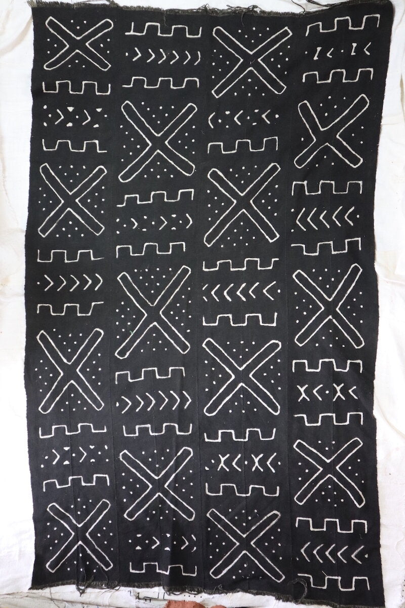 Handspun, handwoven, and hand-dyed with 100% organic cotton. Each Traditional Black Bogolan tells its own wonderfully magical story. These mud-cloths are handmade by our family in Mali and there are slight variations with the coloring and designs of each piece.