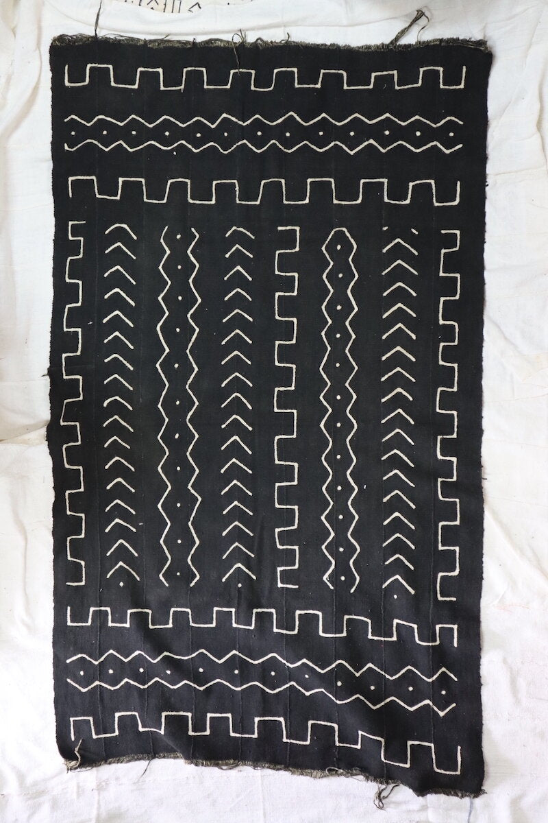 Handspun, handwoven, and hand-dyed with 100% organic cotton. Each Traditional Black Bogolan tells its own wonderfully magical story. These mud-cloths are handmade by our family in Mali and there are slight variations with the coloring and designs of each piece.