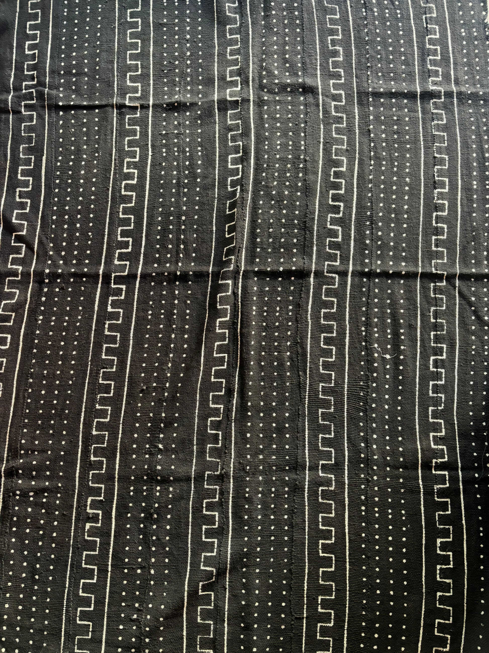 Handspun, handwoven, and hand-dyed with 100% organic cotton. Each Traditional Black Bogolan tells its own wonderfully magical story. These mud-cloths are handmade by our family in Mali and there are slight variations with the coloring and designs of each piece.